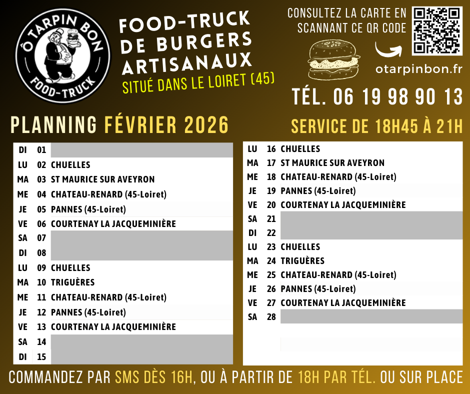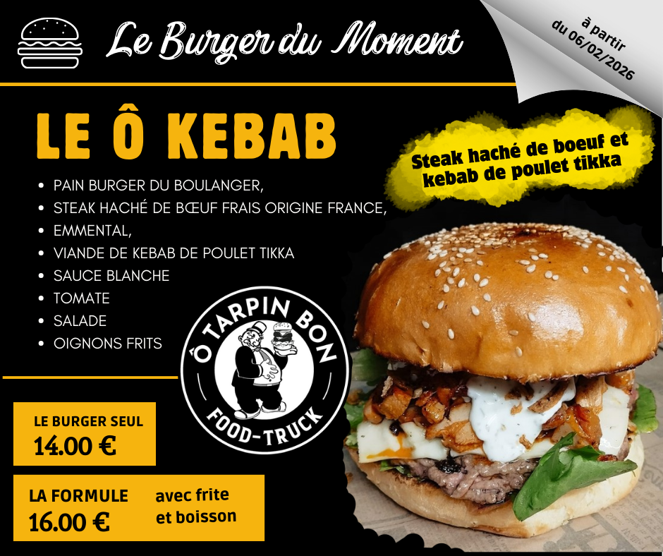 Le Food-Truck Ô Tarpin bon propose des burgers artisanaux de qualité, avec des produits frais, un bun’s fait par un boulanger local, un steak haché de boeuf frais et origine France, mais aussi des wraps, des frites fraîches de producteurs locaux, des boissons sans alcool, ainsi qu’un menu enfant.